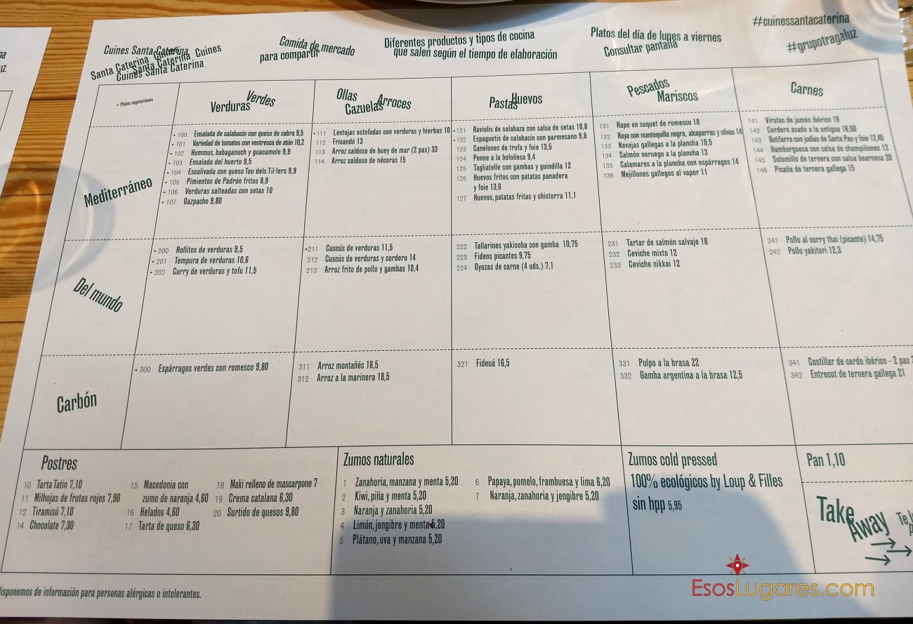 El primer día comimos en un restaurante del Mercado de Santa Caterina que tenía estos precios. En este caso sí era un poco caro para nuestra expectativa.