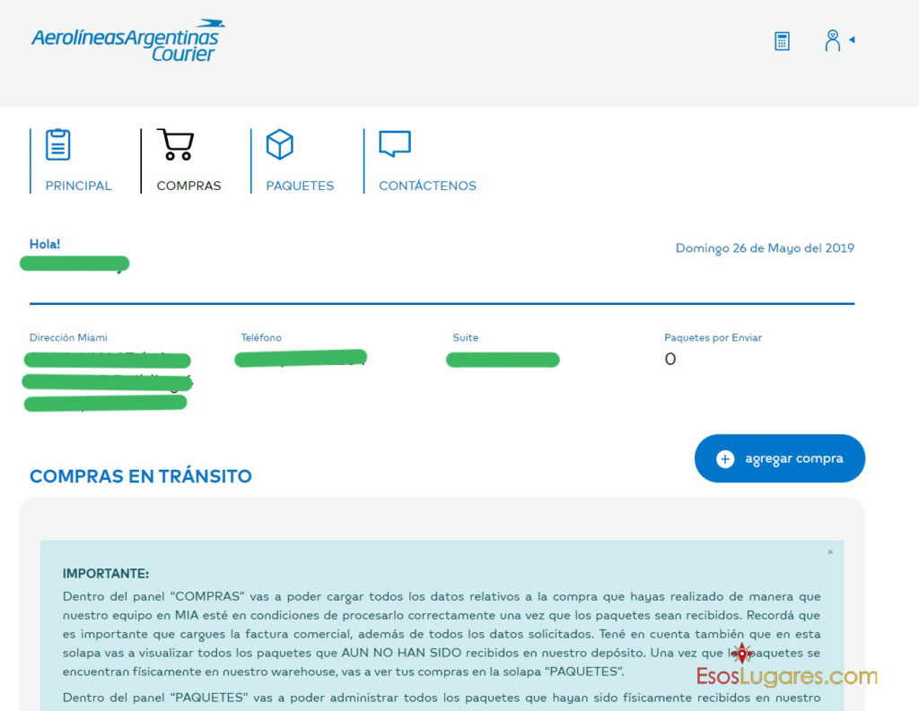 Cuando ya tengamos el numero de seguimiento volvemos a ingresar a nuestra cuenta en la web de Aerolineas Argentinas Courier y vamos a la opción «Compras» y luego al botón «Agregar compra«.